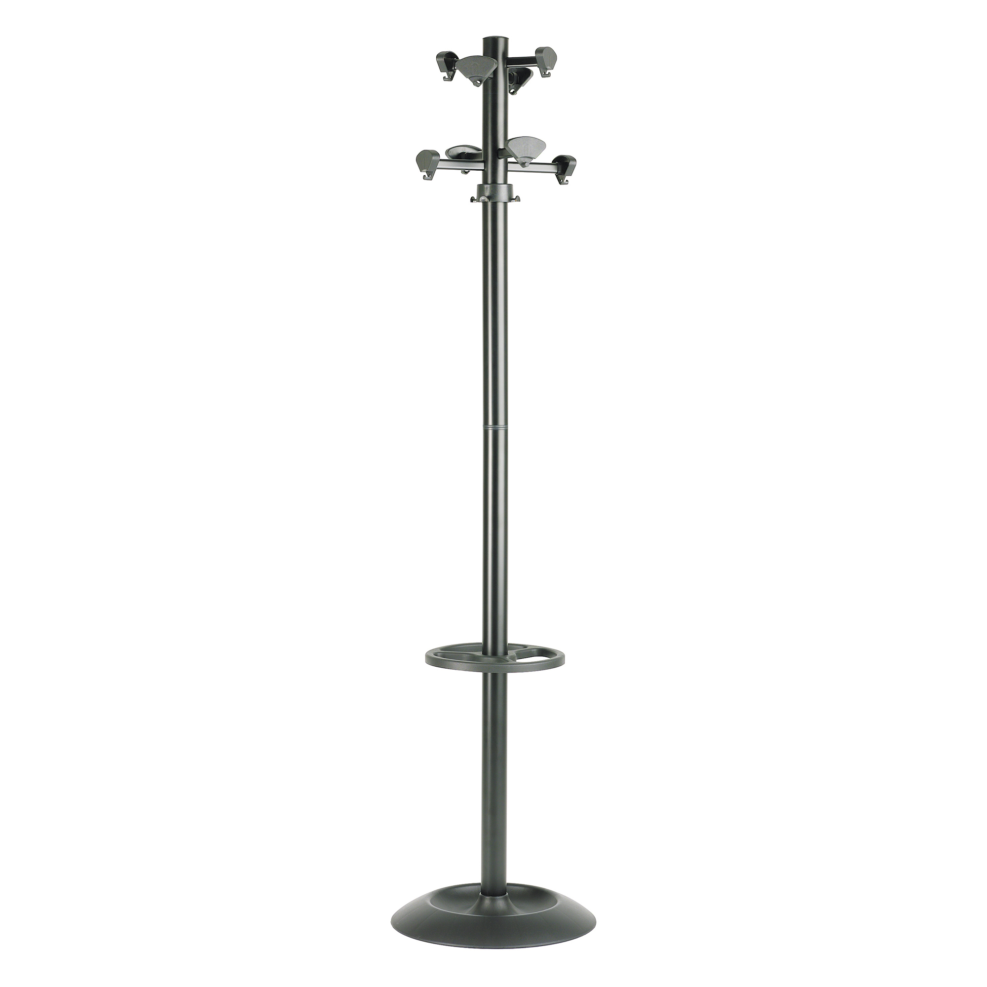 Appendiabiti da terra con stelo in metallo. Base in plastica con vaschetta raccogligocce. Dotato di 8 supporti e portaombrelli. Testa girevole. Dimensioni: 175x39cm