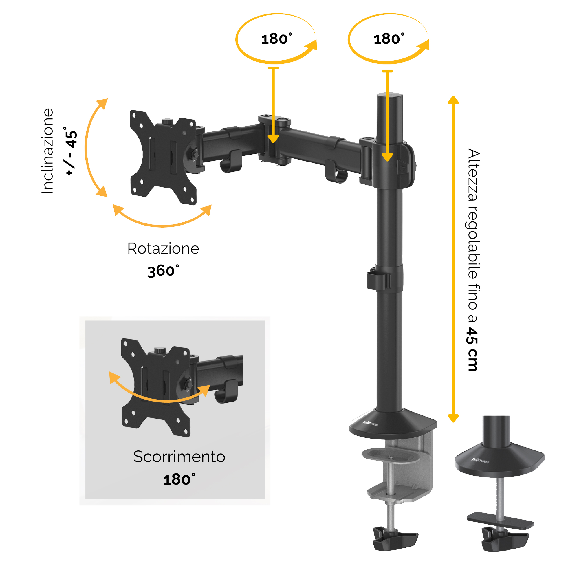 Braccio monitor con sistema di montaggio a morsetto o foro passante. Sistema a palo fisso. Regolabile in altezza fino ad un massimo di 450mm ed estensione di 428mm. Peso max monitor 8kg. Compatibilità VESA
