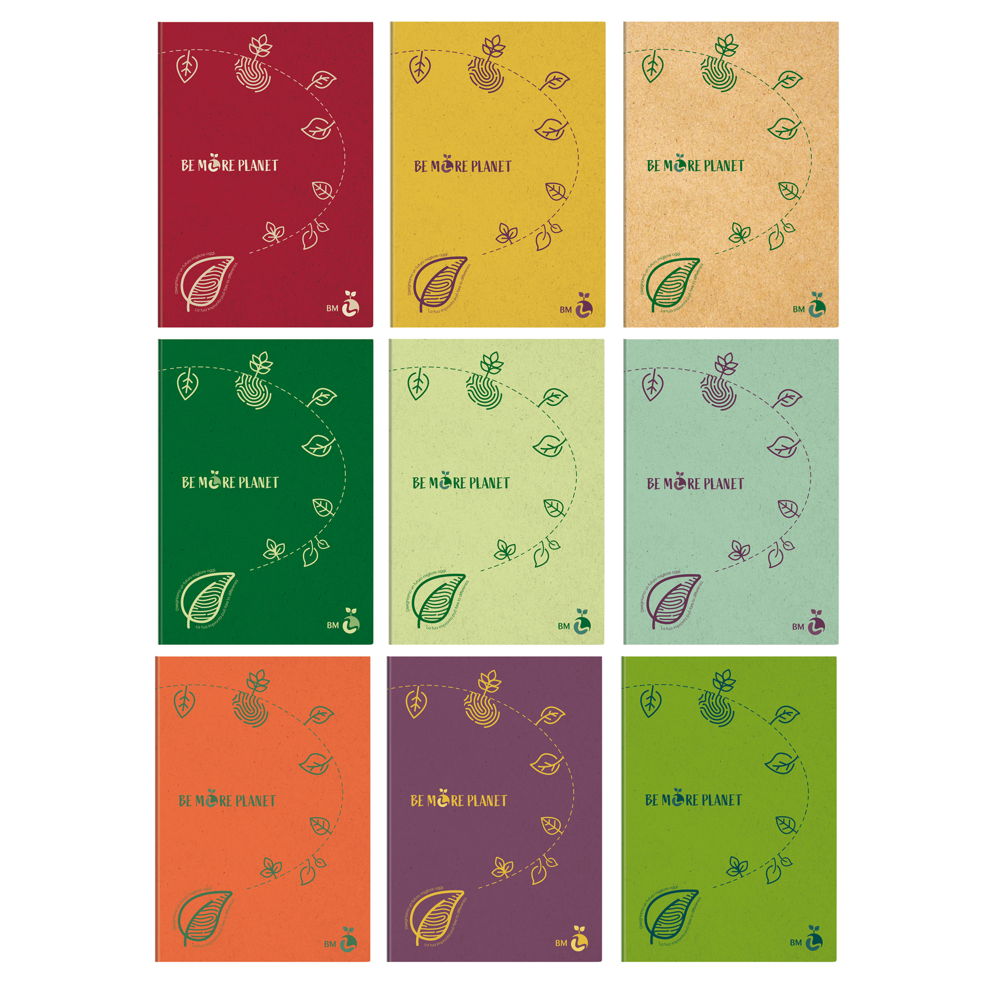 Nuovo maxiquaderno Be More Planet realizzato con materie prime ecosostenibili FSC. Assortimento con 9 colorazioni ispirate alle sfumature della natura. 100% plastic free. Rilegatura con punto metallico.