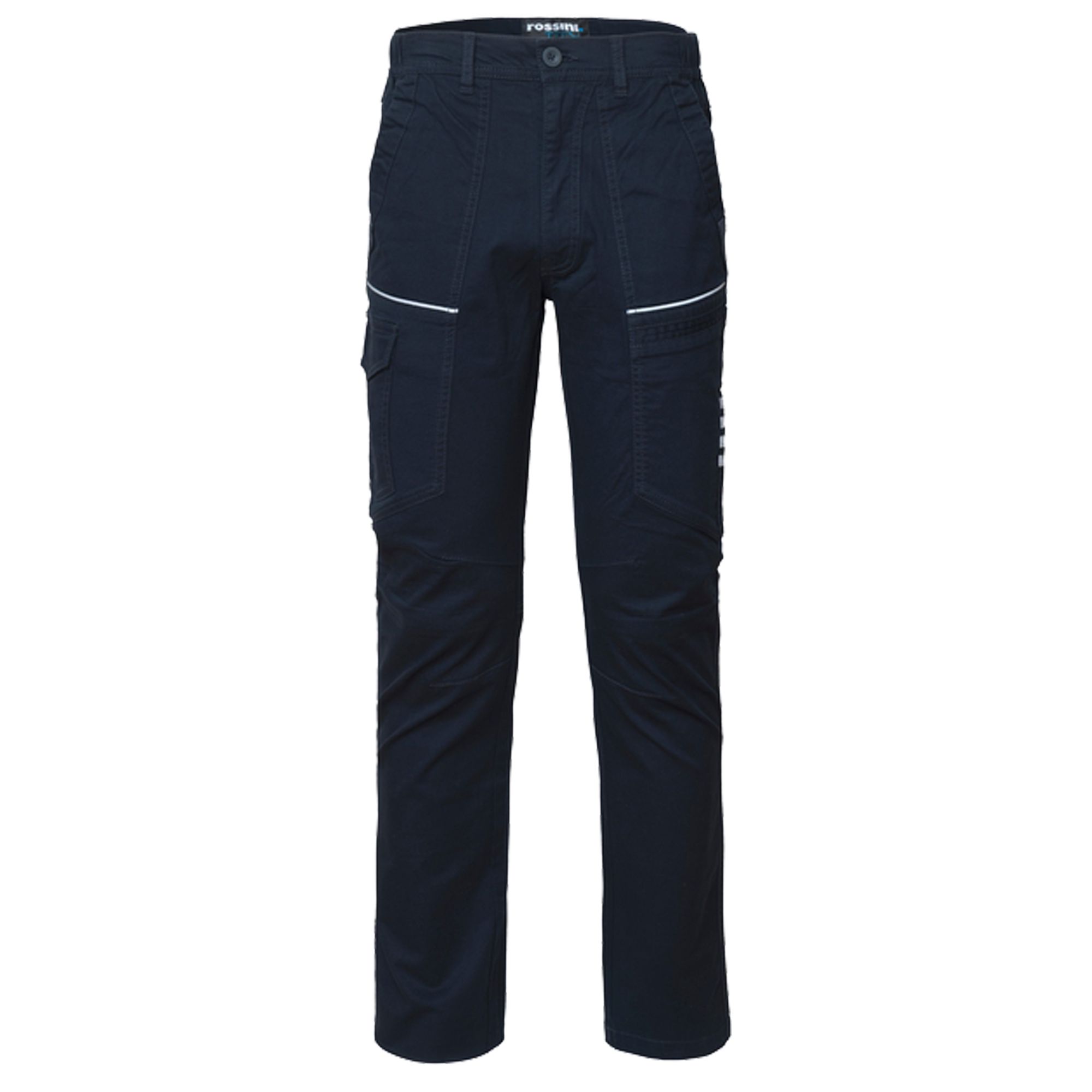 Pantalone da lavoro multitasca e multistagione in cotone twill elasticizzato, con elastici laterali e passanti in vita, chiusura con zip e bottone. Tasca laterale porta metro sulla gamba sinistra e tasca laterale chiusa con aletta e velcro su gamba destra. Triple cuciture al cavallo e pences alle ginocchia per maggior comfort. Profili orizzontali nel taglio delle tasche anteriori e 4 bande su tasca porta metro in tessuto rifrangente. Su ordinazione tutte le taglie da XS a XXL.