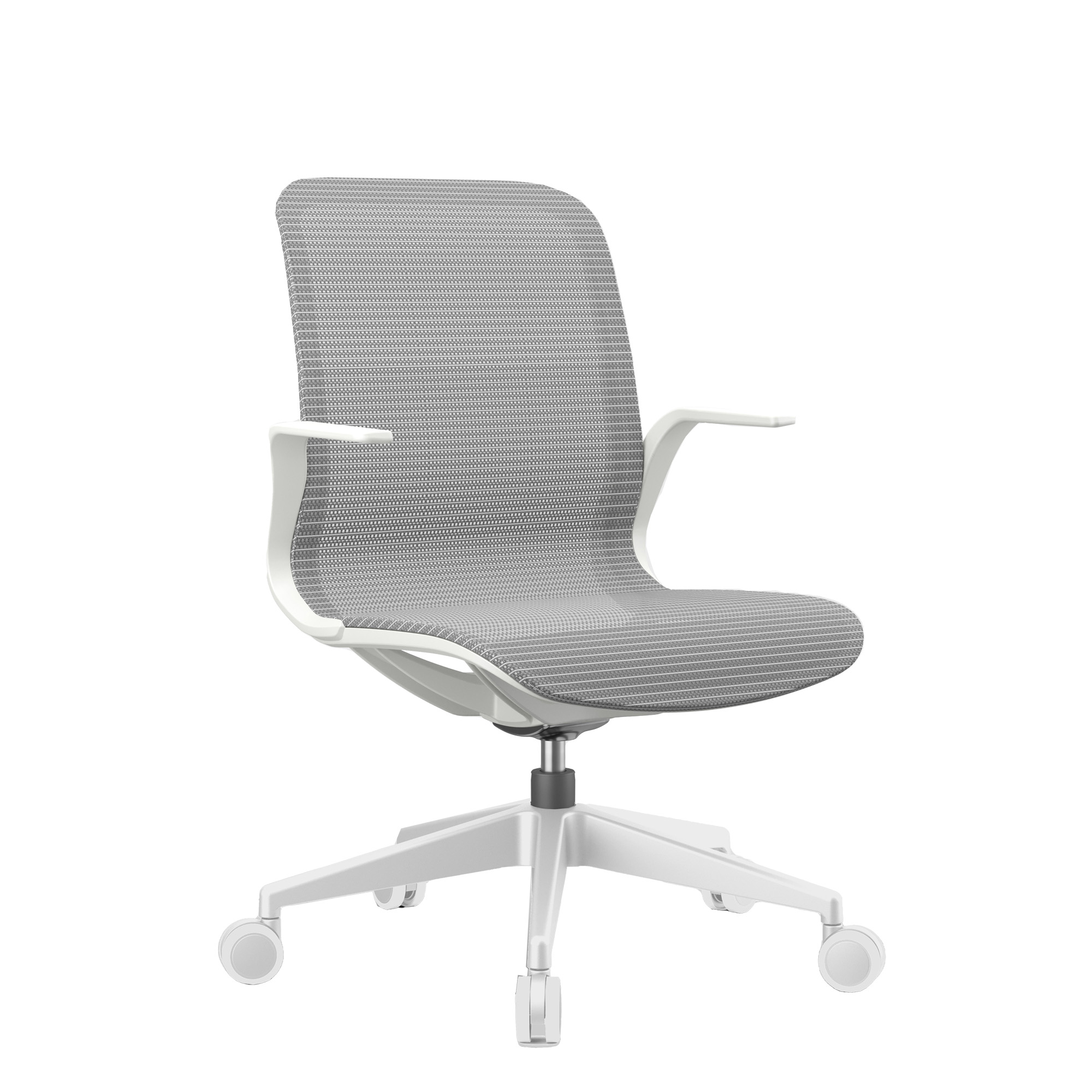 Poltrona direzionale girevole con elevazione a gas – meccanismo oscillante – base nylon. Rivestimento seduta in rete bianca. Braccioli inclusi (non rimovibili). Alt.tot.: 88-111cm; Prof.tot.: 66cm; Alt.schienale: 51cm; Larg.schienale: 46cm; Larg.seduta: 49cm; Prof.Sedile: 46cm; Altezza sedile: 44 – 55cm.