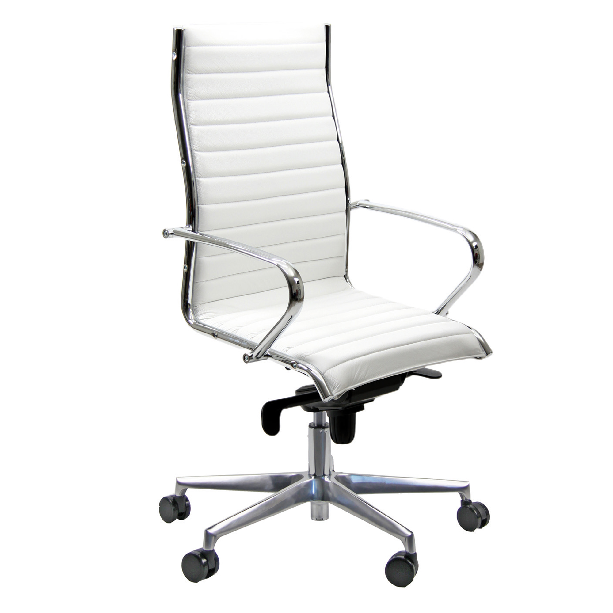 Poltrona direzionale con schienale alto. Struttura e braccioli in acciaio cromato, rivestimento in pelle. Base in acciao sezione ellittica. Meccanismo multiblock oscillante con fulcro avanzato, regolazione in altezza con pistone a gas (corsa 11cm). 16kg. Rivestimento seduta in tessuto “TOP – vera pelle smerigliata”. Braccioli inclusi (non rimovibili). Altezza totale: 105-116cm; Profondità tot: 68cm; Alt. schienale: 60cm; Larghezza schienale: 48cm; Larghezza sedile:50cm; Profondità sedile: 50cm; Alt.sedile: 42-54cm.