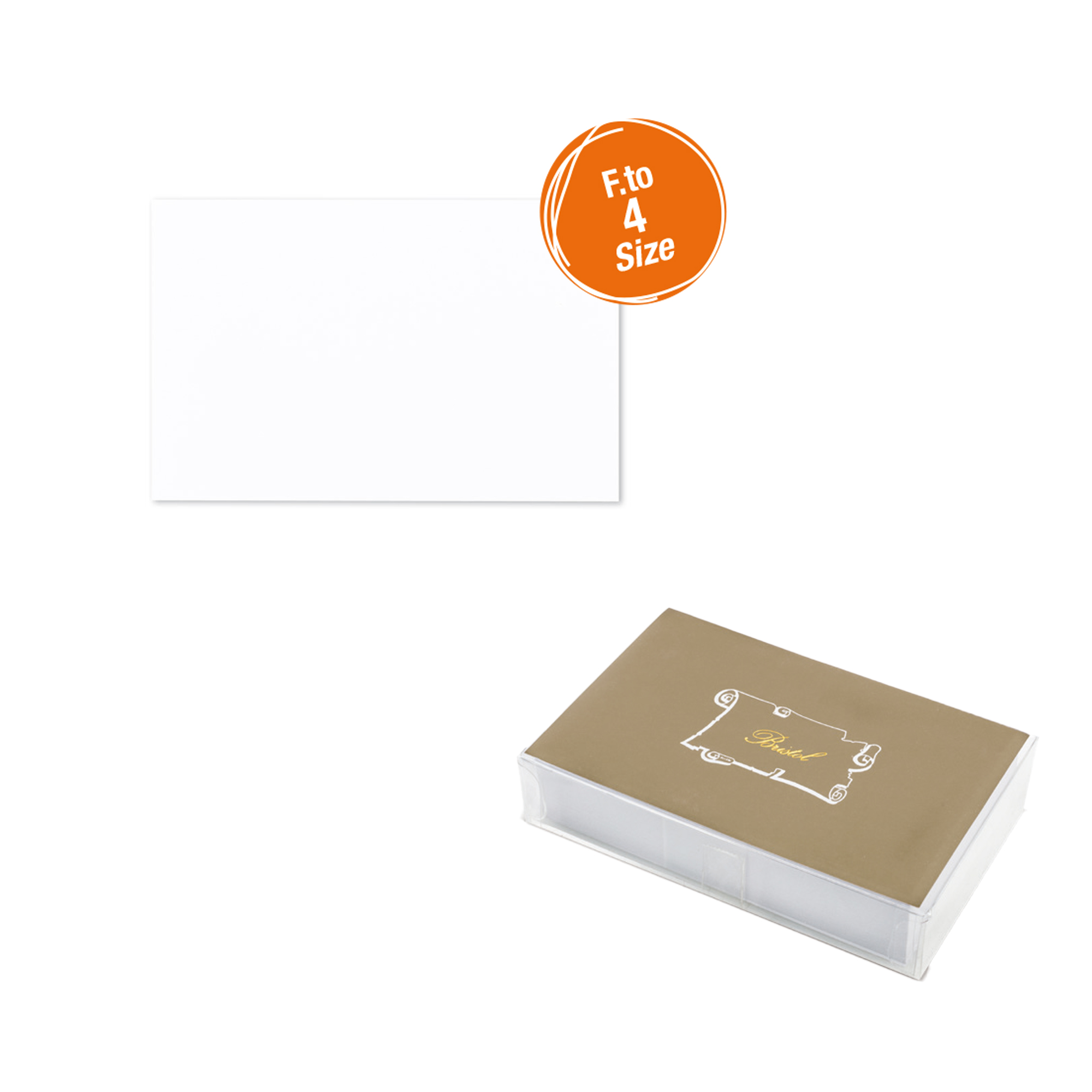 Scatola in acetato trasparente con 100 cartoncini bianchi da 240gr liscio. Formato 4-69x106mm.