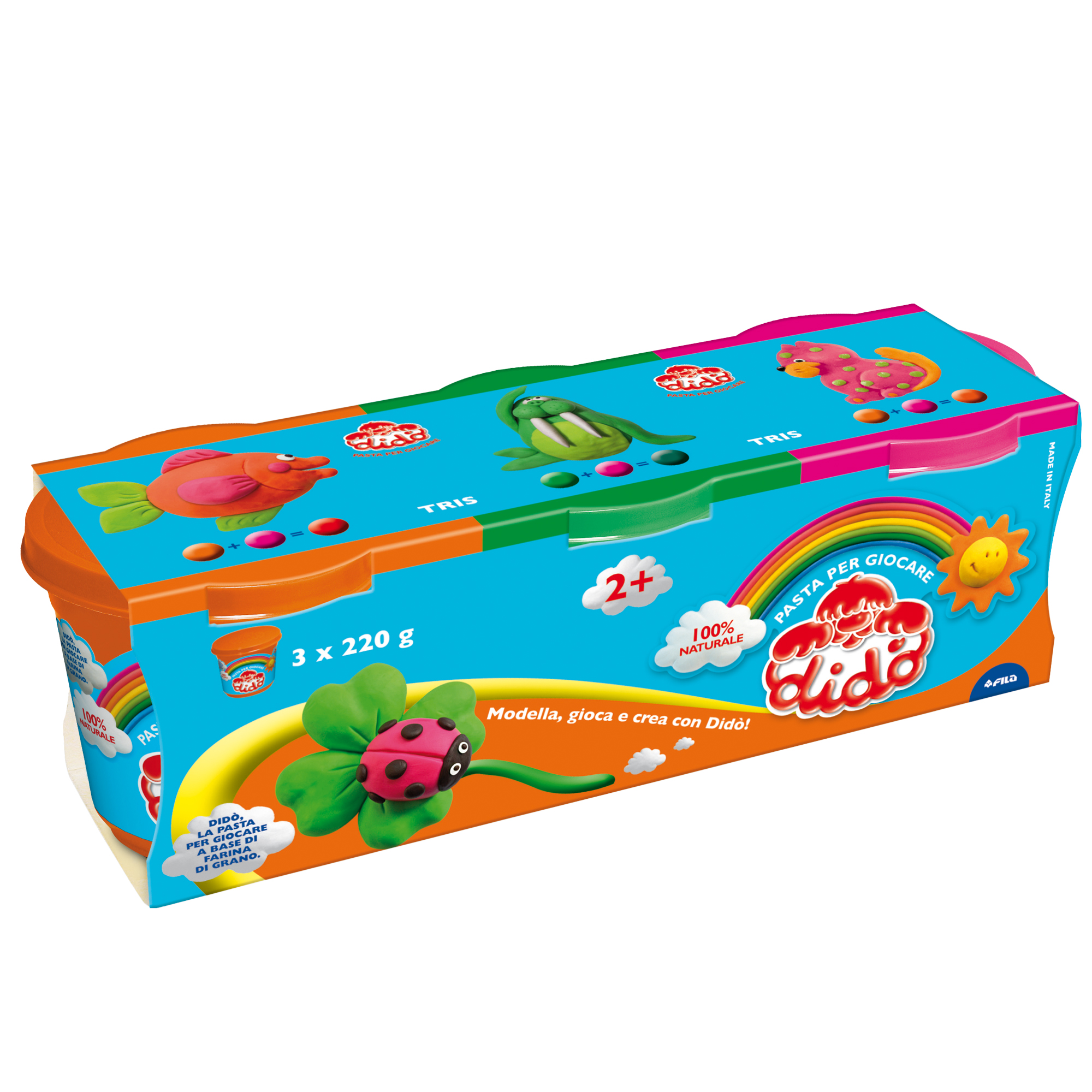 Pasta per giocare morbida, fatta con ingredienti naturali. E’ innocua e non macchia. 3 barattoli da 220gr nei colori erde-arancio-magenta.